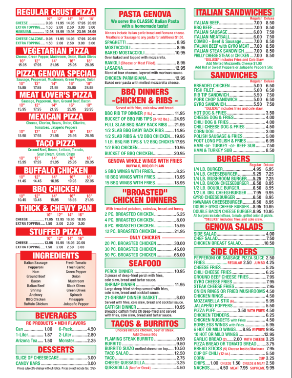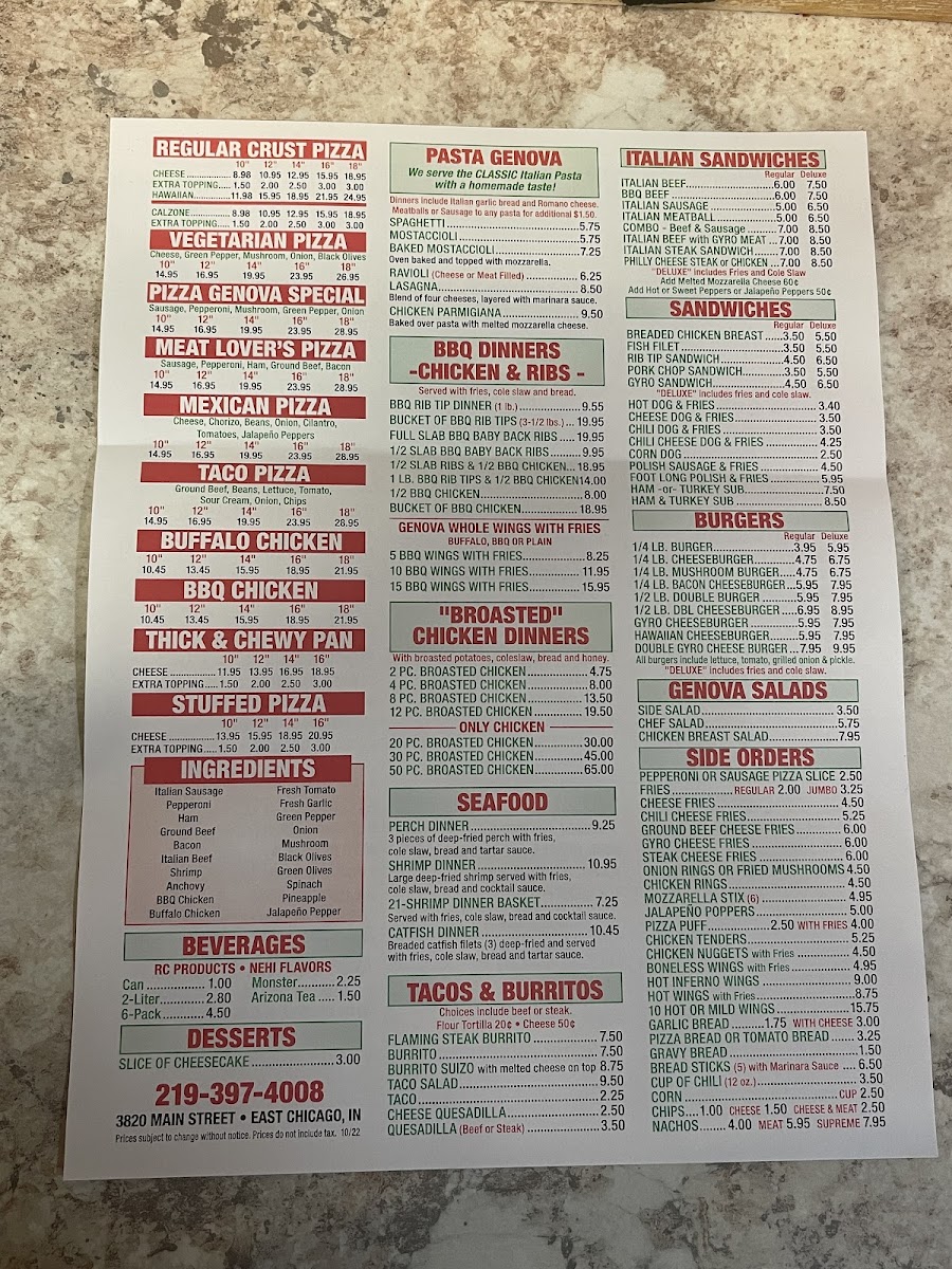 Discover the delightful offerings at Genova Pizza, located at 3820 Main St, East Chicago. This charming eatery specializes in mouthwatering pizzas and hearty broasted chicken dinners, making it a favorite for families and friends alike. Their Vegetarian Pizza, loaded with cheese, green peppers, mushrooms, onions, and black olives, is a must-try at just $15.95.